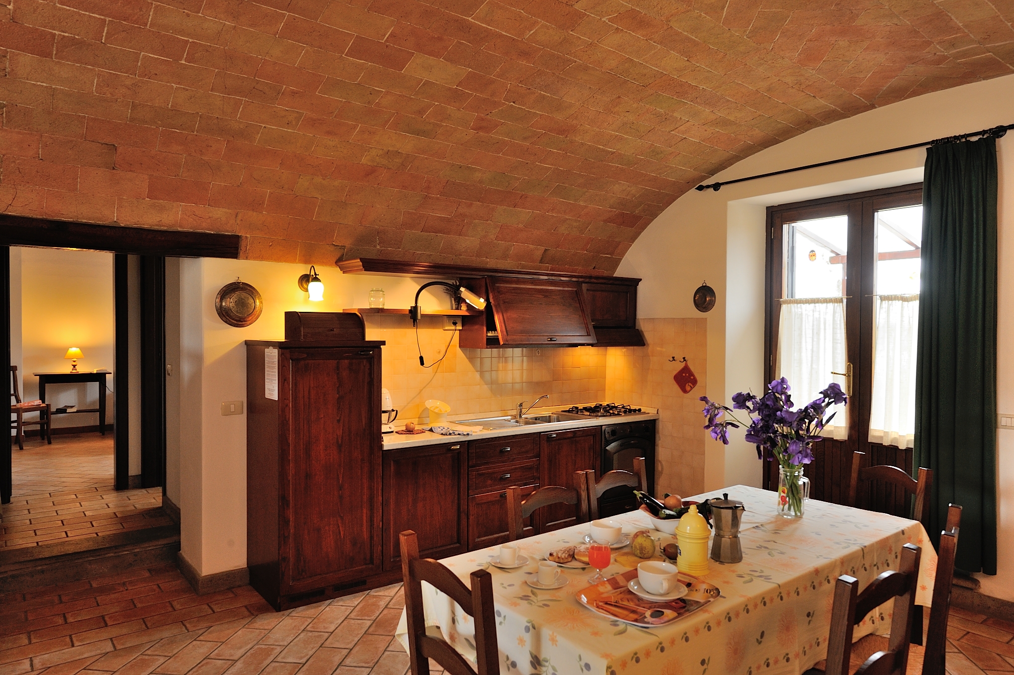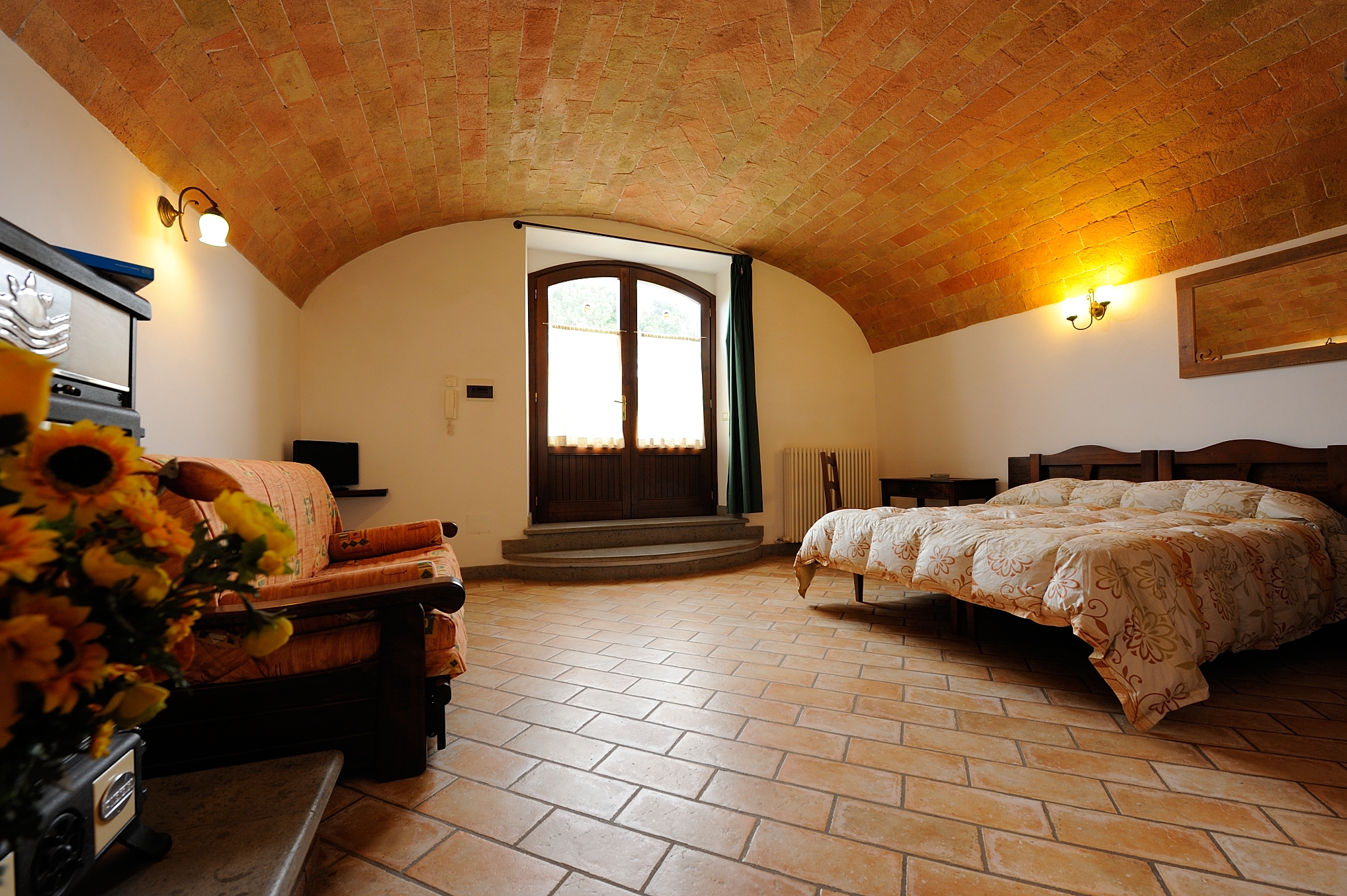 Die Ferienwohnung Millefiori liegt im Erdgeschoss und hat sogar zwei separate Eingänge, im Norden und Süden! Außerdem erwarten Dich zwei Terrassen in dieser einzigartigen Ferienwohnung. Ursprünglich eine alte Stallung, zeichnet sie sich durch eine originale Gewölbedecke aus Terrakotta aus, deren Farben dich in vergangene Zeiten entführen werden. Ein Bereich dieses Raumes wurde als Schlafbereich mit einem Doppelbett eingerichtet, während der andere als Wohnküche dient. Die Ferienwohnung verfügt außerdem über ein weiteres Schlafzimmer mit Doppelbett und ein geräumiges Badezimmer mit Dusche.