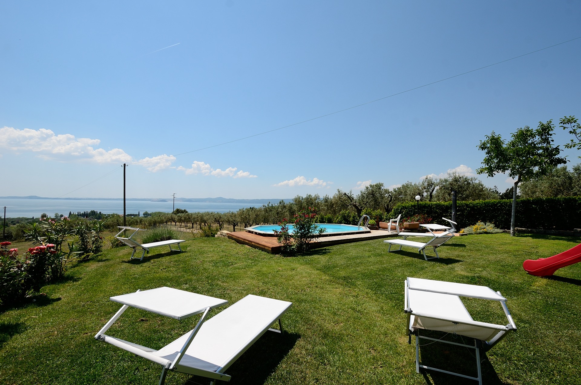 Der große traumhafte Garten mit Blick auf den Bolsenasee wird Euch begeistern. Den Gästen steht ein 8 x 5 Meter großer Panoramapool aus Holz zur Verfügung.